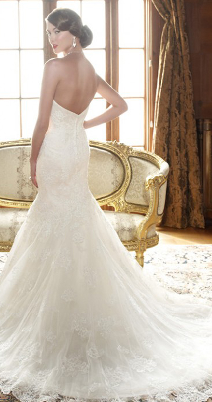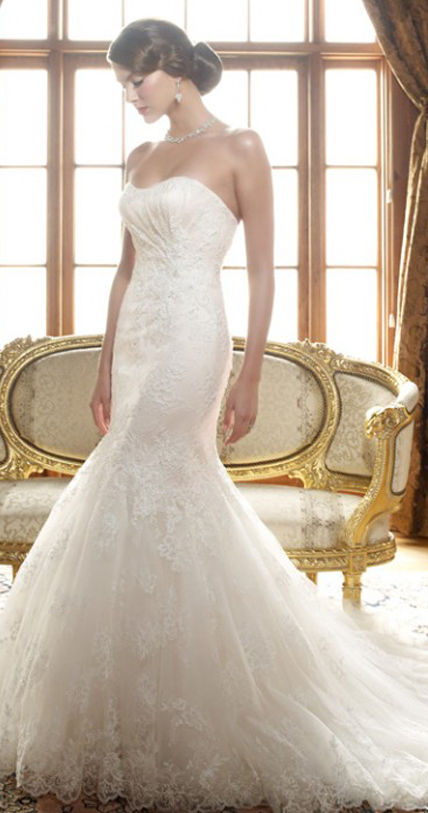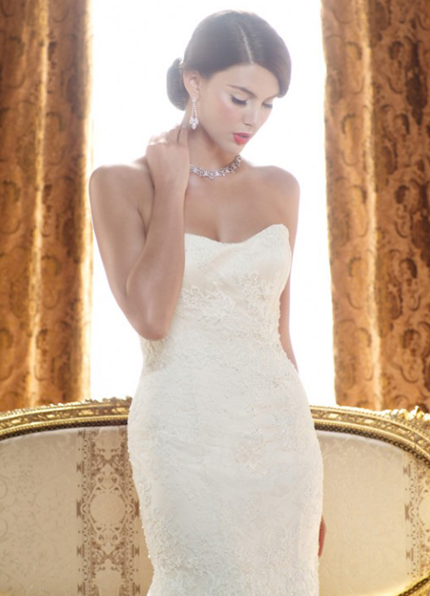 Description: This jaw-dropping strapless soft-sweetheart neckline bridal gown has a mermaid silhouette with a stunning beaded lace overlay. The bodice is lined with Silky Satin and the skirt is layered with netting. Beaded lace overlay is accented with additional beaded lace appliqués accented with freshwater pearls, Swarovski Crystals and crystal sequins. This wedding dress is simply magnificent!