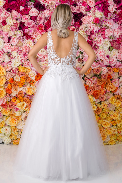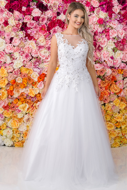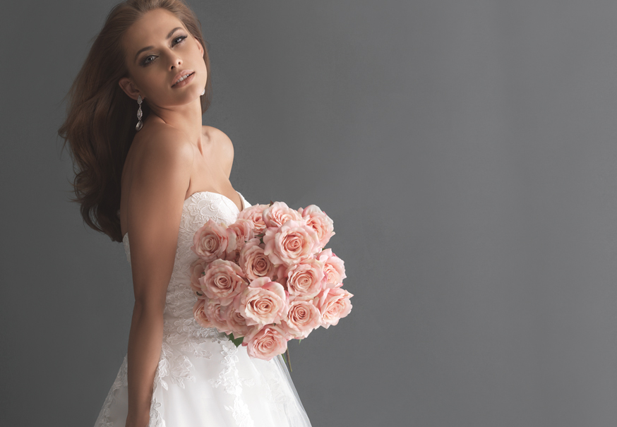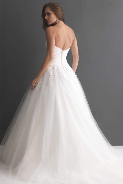 This is the style of dress that fairy tales are made of. The Allure Romance 2657 ballgown topped our November Best Sellers list. The simple yet elegant bridal gown is created from soft lace Appliqué and English net. While most brides will look beautiful in a ball gown, the cut is ideal for slender or pear-shaped figures as the full skirt helps to accentuate the waist and hide the lower body. Additionally, this style helps create the hourglass look because it emphasises the waistline. The strapless, sweetheart bodice which is adorned in lace is one of the most popular necklines with our brides, mainly because of its romantic connotations and the Cinderella-style silhouette it creates.