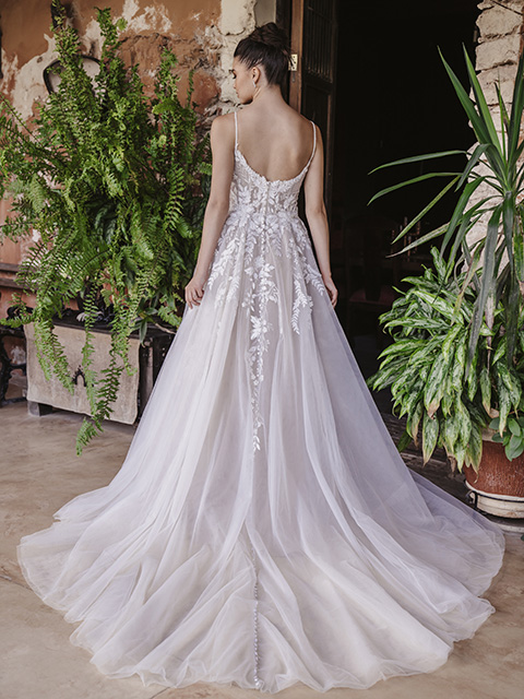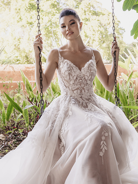 The Allure 9951 holographic wedding gown incorporates soft dimensional lace accented with a gorgeous glitter to make this full A-line gown truly sparkle. See more special wedding dresses like the Allure 9951 with this motif in our collections!