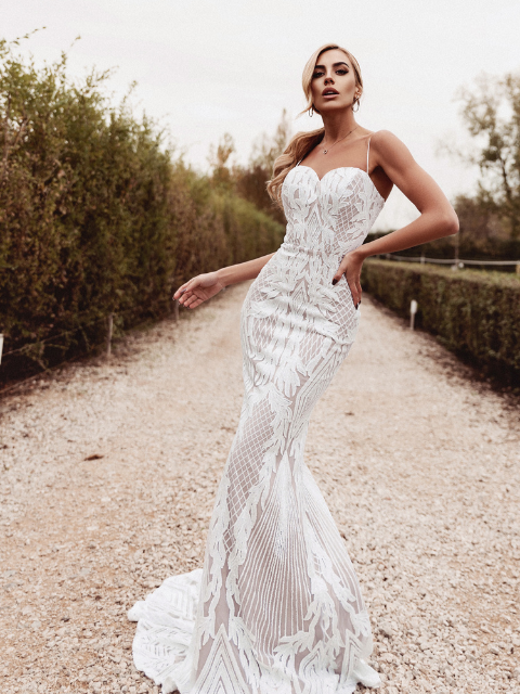 Glow in elegance on your big day with our White Sequin Embroidered Mermaid Wedding Dress. Sparkle and sophistication in one stunning gown!