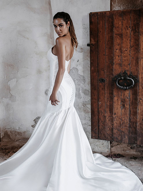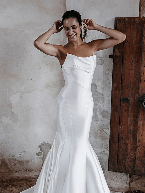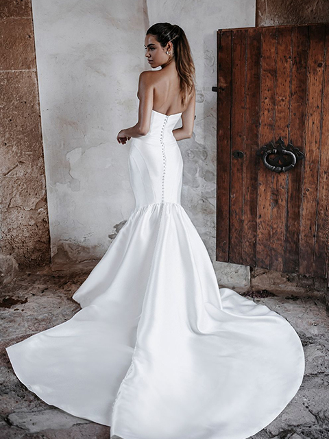 A dramatic strapless neckline adds drama and eye-catching detail to CarmenÕs subtly minimalist silhouette.