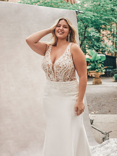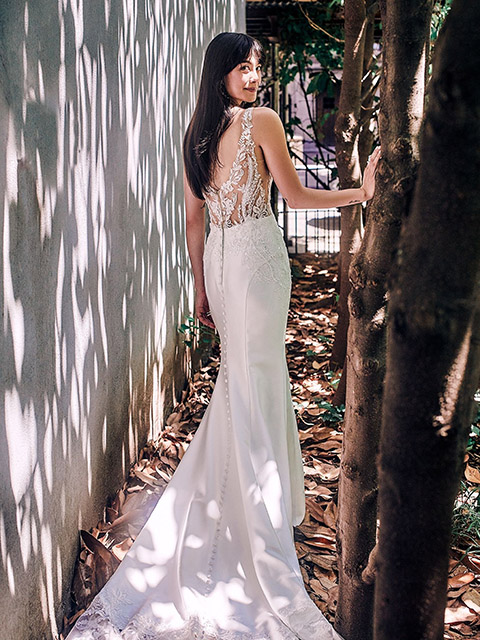 Sequined floral appliquŽs adorn LibertyÕs illusion bodice and sheer hemline.