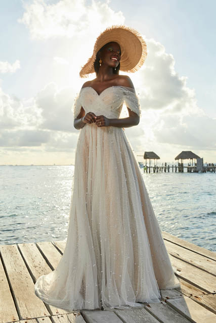 Ethereal pearl accents shimmer across the soft tulle of this off-shoulder A-line gown.
