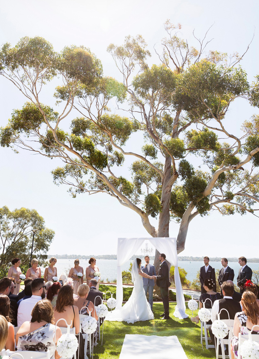 The beautiful ceremony took place along the riverside at Heathcote Reserve followed by a beautifully-styled white wedding reception at Pagoda Resort & Spa. The beautiful resort and spa which overlooks the Swan River in the suburb of Como is an upscale, Asian-inspired resort flanked by a pagoda dating back to 1926.
